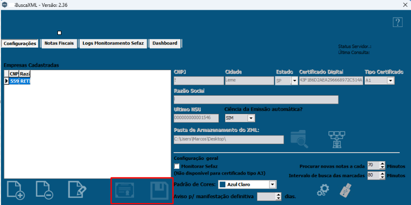 Editar o Cadastro da Empresa na aba Configurações, selecionar o certificado atual e gravar
