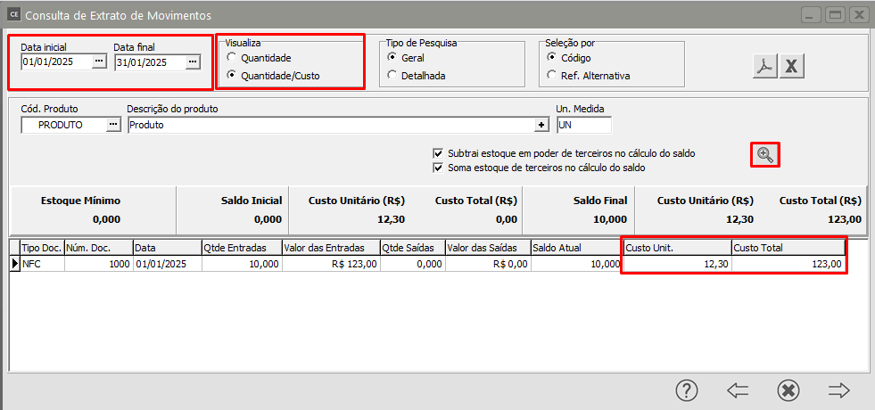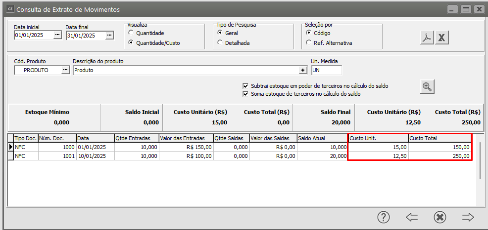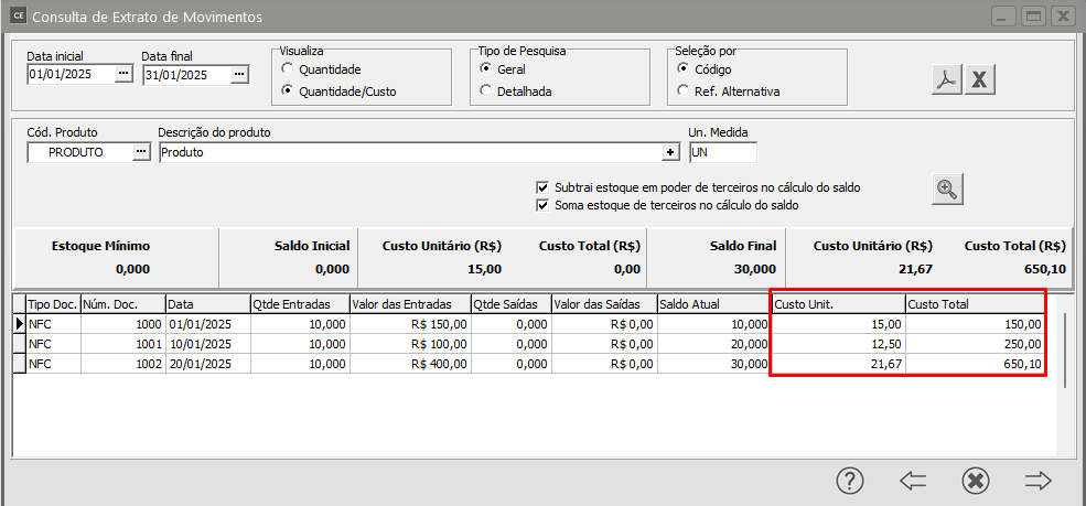 Ao visualizar novamente o Extrato do Produto você irá verificar o Cálculo do Custo Médio realizado pelo Sistema