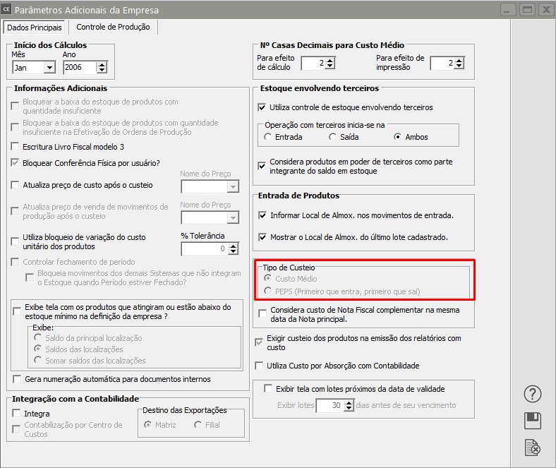 Na aba Dados Principais - Campo Tipo de Custeio, defina Custo Médio