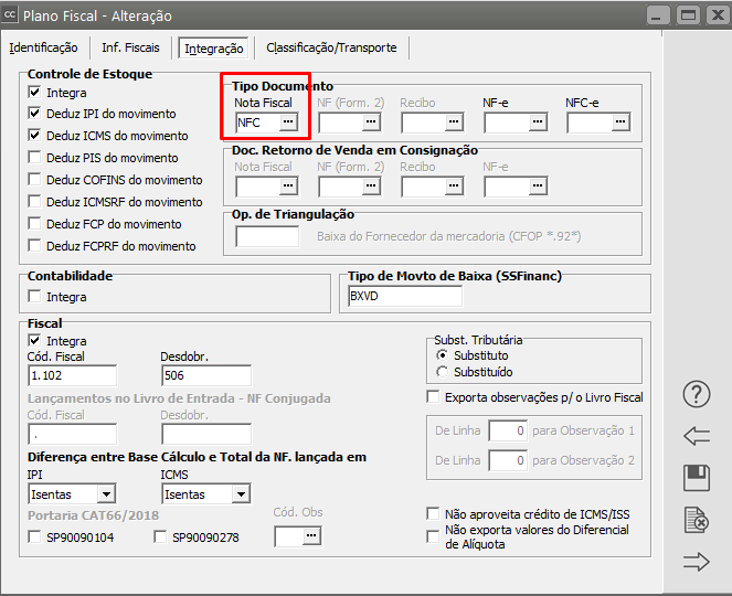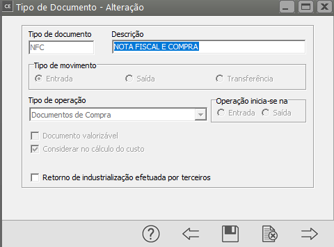 Se você utiliza o Sistema Controle de Compras, o CFOP utilizado no cadastro do documento de compra que for cadastrado, obrigatoriamente deverá estar integrado ao Sistema Controle de Estoque com o Tipo de Documento que Considera no Cálculo do Custo