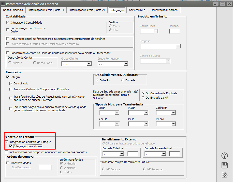 Na aba Integração do Sistema Controle de Compras deverá estar assinalado que Integra com o Sistema Controle de Estoque