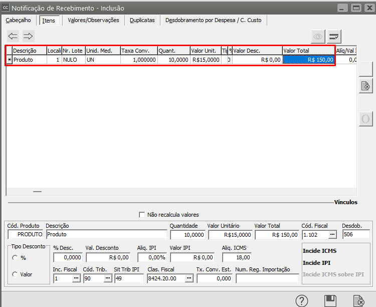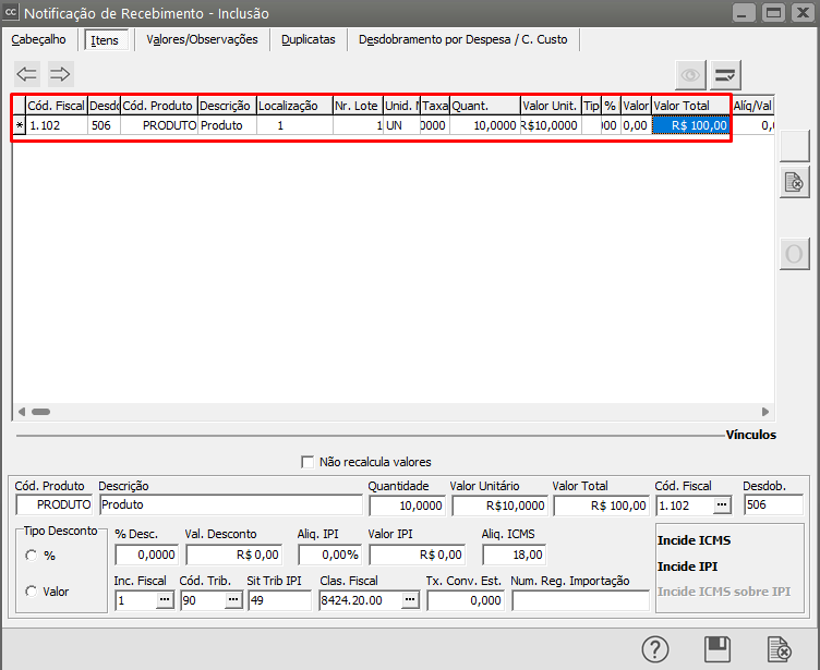 Ao cadastrar a Notificação de Recebimento e informar o CFOP que integra com o Sistema Controle de Estoque com um Tipo de Documento Considera no Cálculo do Custo