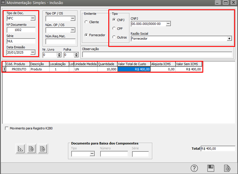 c) NFC cadastrada diretamente no Sistema Controle de Estoque com 10 unidades no valor total de R$ 400,00