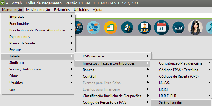Para acessar a tabela de Salário Família, acesse o menu Manutenção>Tabelas>Impostos Taxas e Contribuições>Salario Família