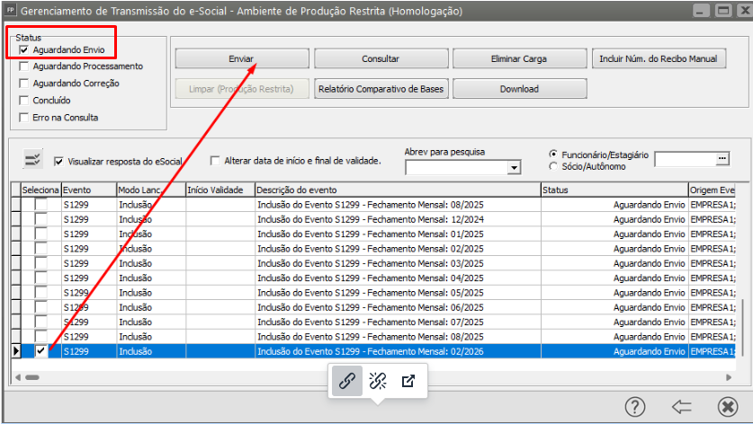 Filtre Status Aguardando Envio, selecione o evento e faça o envio para o Portal do eSocial