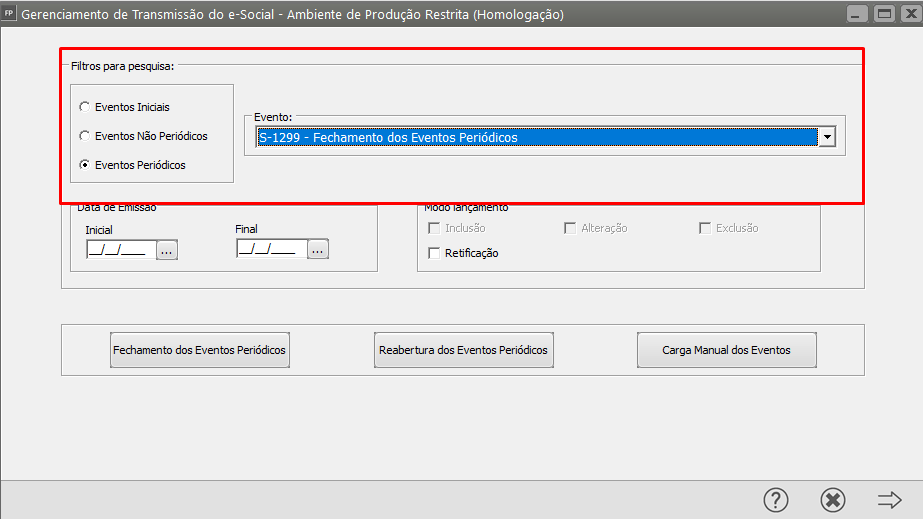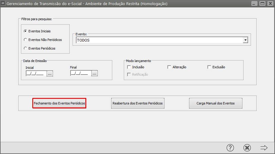 Será apresentada a tela do Gerenciamento, clique no botão Fechamento dos Eventos Periódicos