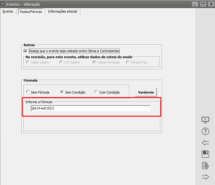 Editar o evento que apresentou o erro, na aba Rateio/Fórmula e realizar a conferência da fórmula cadastrada para o evento