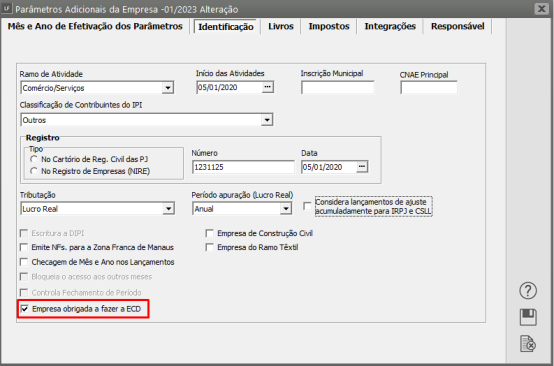 Na Aba “Identificação” selecionar Empresa Obrigada a Fazer a ECD.
