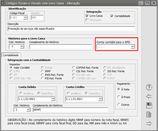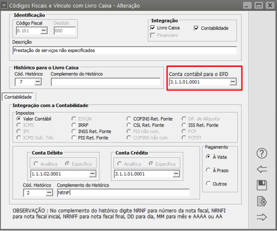 No menu Manutenção>Integrações>Conta contábil>Códigos Fiscais e vinculo com o Livro Caixa