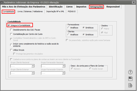 Na Aba “ Integrações” e “Contabilidade” selecionar Integra a Contabilidade.