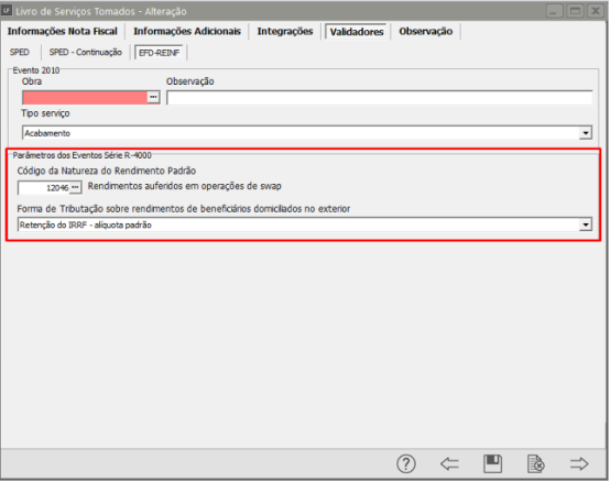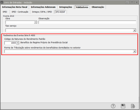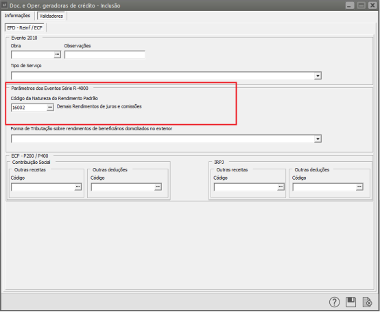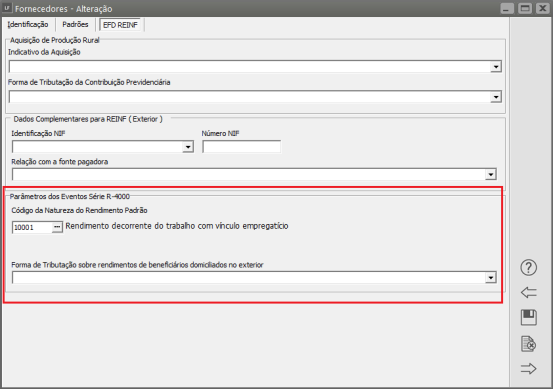 Na aba “Reinf” escriture o Código de Natureza do Rendimento Padrão. Essa informação deverá ser preenchida por obrigatoriedade para o envio do R-4020.