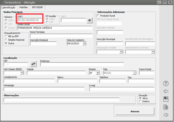 Os fornecedores pessoa jurídica deverão ser cadastrados no Menu Manutenção>Fornecedores>Cadastra.