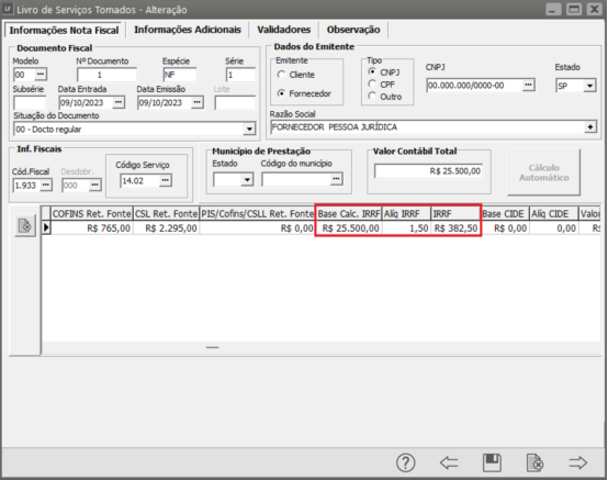 Faça a escrituração das informações da nota não esquecendo de preencher as retenções quando houver e o Código de natureza do rendimento.