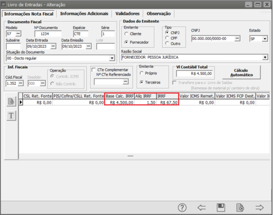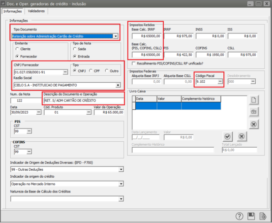 Faça a escrituração das informações do documento não esquecendo de preencher as retenções quando houver e o Código de natureza do rendimento.