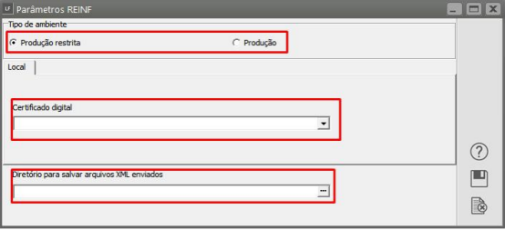 Para o envio dos eventos com validade jurídica o Tipo de ambiente deve estar marcado como “Produção”, pois produção restrita é o modo teste (homologação). Selecionar o Certificado Digital e indicar uma pasta para a geração dos Xmls dos eventos enviados.