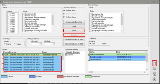 Clicar no botão “Enviar” e na sequência no botão “Consultar”. A resposta retornará como “Processado” ( aprovado) ou “Aguardando correção” (reprovado). No caso de reprovação do evento verificar a mensagem de retorno do eCAC e fazer as devidas correções no Sistema. Depois eliminar o evento, gerar e consultar novamente.