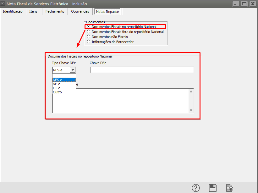 - Tipo Chave DFe (Documento Fiscal Eletrônico) - NFSe, NFe, CTe ou Outro