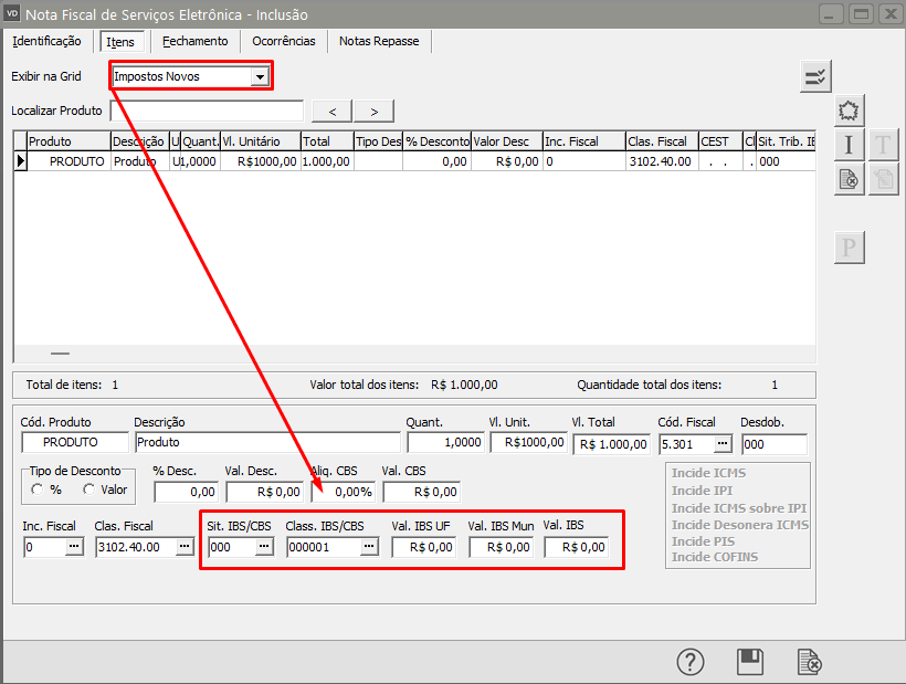 Informe o Item e se no cadastro do produto foi informado os campos Situação IBS/CBS e Classificação IBS/CBS essas informações serão preenchidas automaticamente