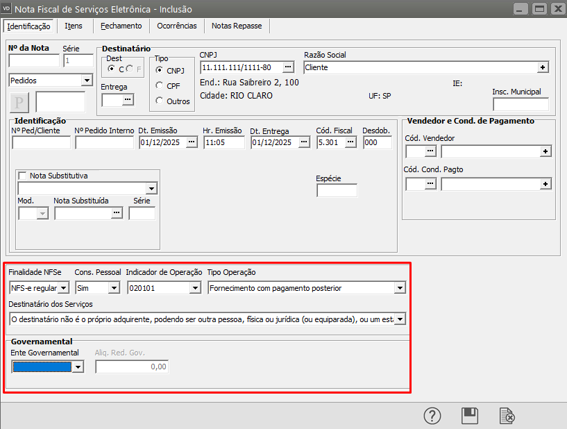 Informe o Destinatário da NFSe e o CFOP que você configurou anteriormente