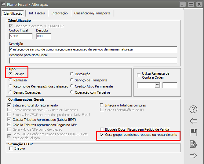 - Ao informar nos Parâmetros do Gerenciador da NFSe que o Município de Envio da NFSe é Ginfes ou São Paulo, o Sistema habilitará um novo campo na aba Identificação do CFOP utilizado por sua Empresa, "Gera Grupo Reembolso, Repasse ou Ressarcimento", selecione o campo