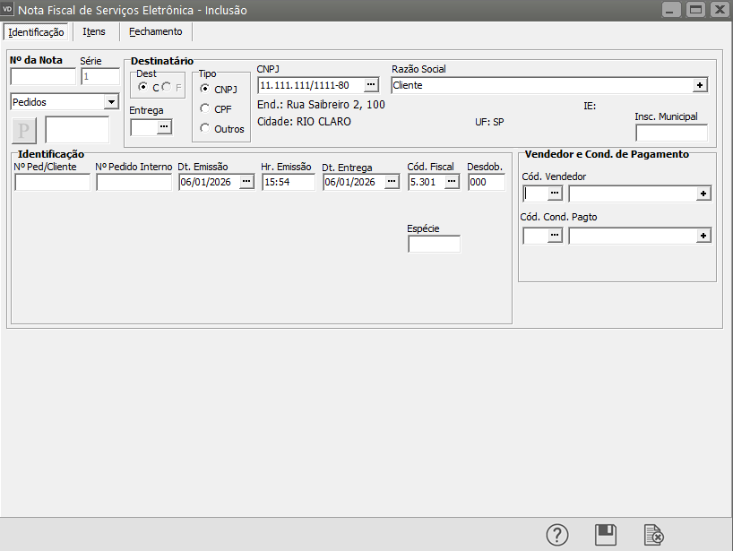 Informe o Destinatário da NFSe e o CFOP que você configurou anteriormente